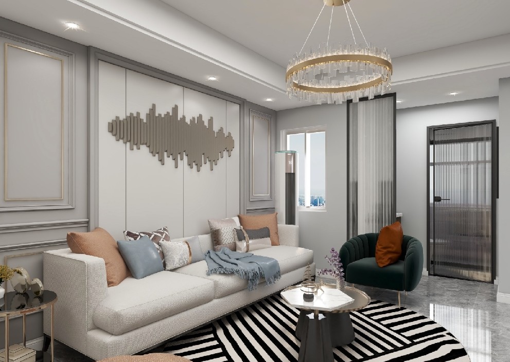 电视背景墙,白色的电视墙石膏线条,其呼应沙发背景墙面;
