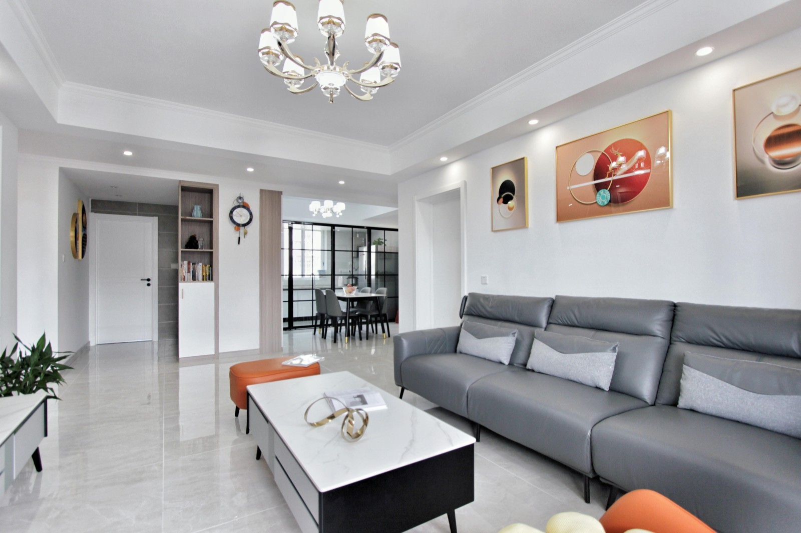 在简约的硬装背景下,是以橙灰相接的撞色软装搭配,窗帘、装饰画、沙发,都烘托着这一主题。