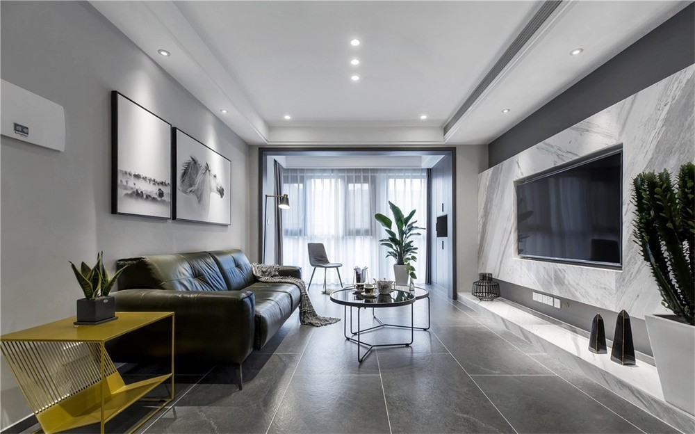整体墙面以简单的浅灰色为主基调,随遇而安的氛围在步入客厅就能感受到,墨绿色的皮质沙发毫无疑问是一大吸睛点,提升逼格的同时限制了周围颜色的铺展