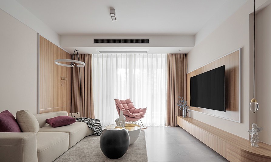 客厅以木色与米色为基调,配上简约的家具,交织出温柔舒适的气氛。沙发背景采用乳胶漆与木饰面装饰,深浅的色彩变化增加层次感。