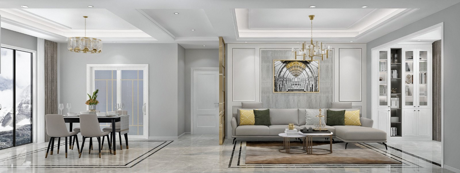 独特的简约欧式风格,古典精致,门厅,客厅与餐厅通过隐性划分,巧妙运用了金属定制隔断,提升空间格调;