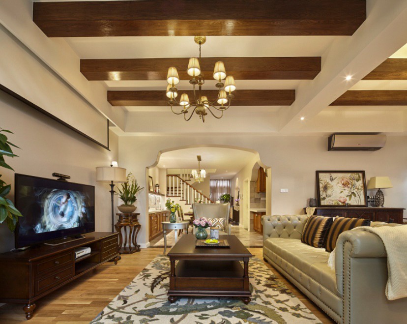 客厅以原木色、米色系为主体色调,设计师在硬装处理上侧重营造稳重大气、简洁雅致的居家氛围——客厅区保留方正利落的线条,空间过渡处以弧型梁柱区隔不同功能区,同时又柔化了客厅的棱角。 门洞与天花做了木梁处理,在吊灯暖光的映衬下,木的肌理一览无遗,颇具复古情调。