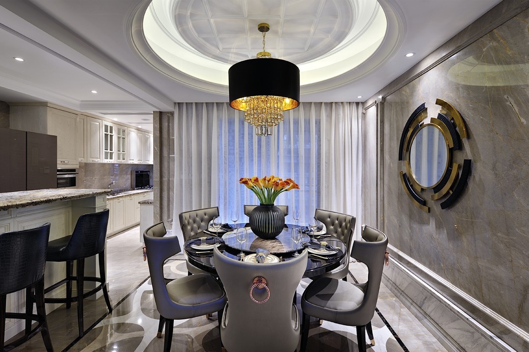 餐厅以灰色为主基调,其中黄色、爱马仕橙的点缀打破了灰的单调,悦动亮丽的爱马仕橙、轻快的黄色也成了点睛之笔,使整个黑灰纯粹色彩的餐厅多了几分生动与暖意,再以一抹金色作补,丰富的层次之间尽显轻奢魅力。