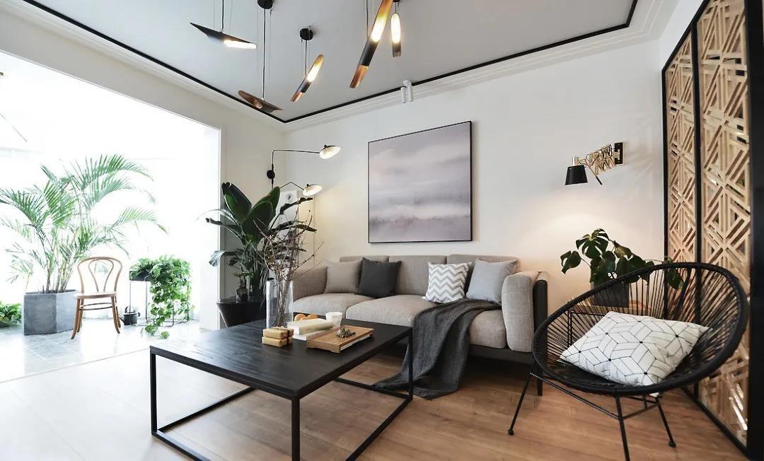 ▲客厅,整体以经典的黑白灰搭配为主,加上木地板、金色灯具、绿植的点缀,营造宁静悠然的意境之美。