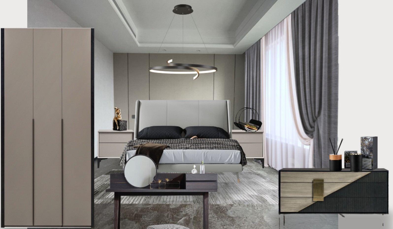 主卧主要以极简为主,大软靠的床在静谧的夜晚悠闲的看本书享受宁静的时光。
