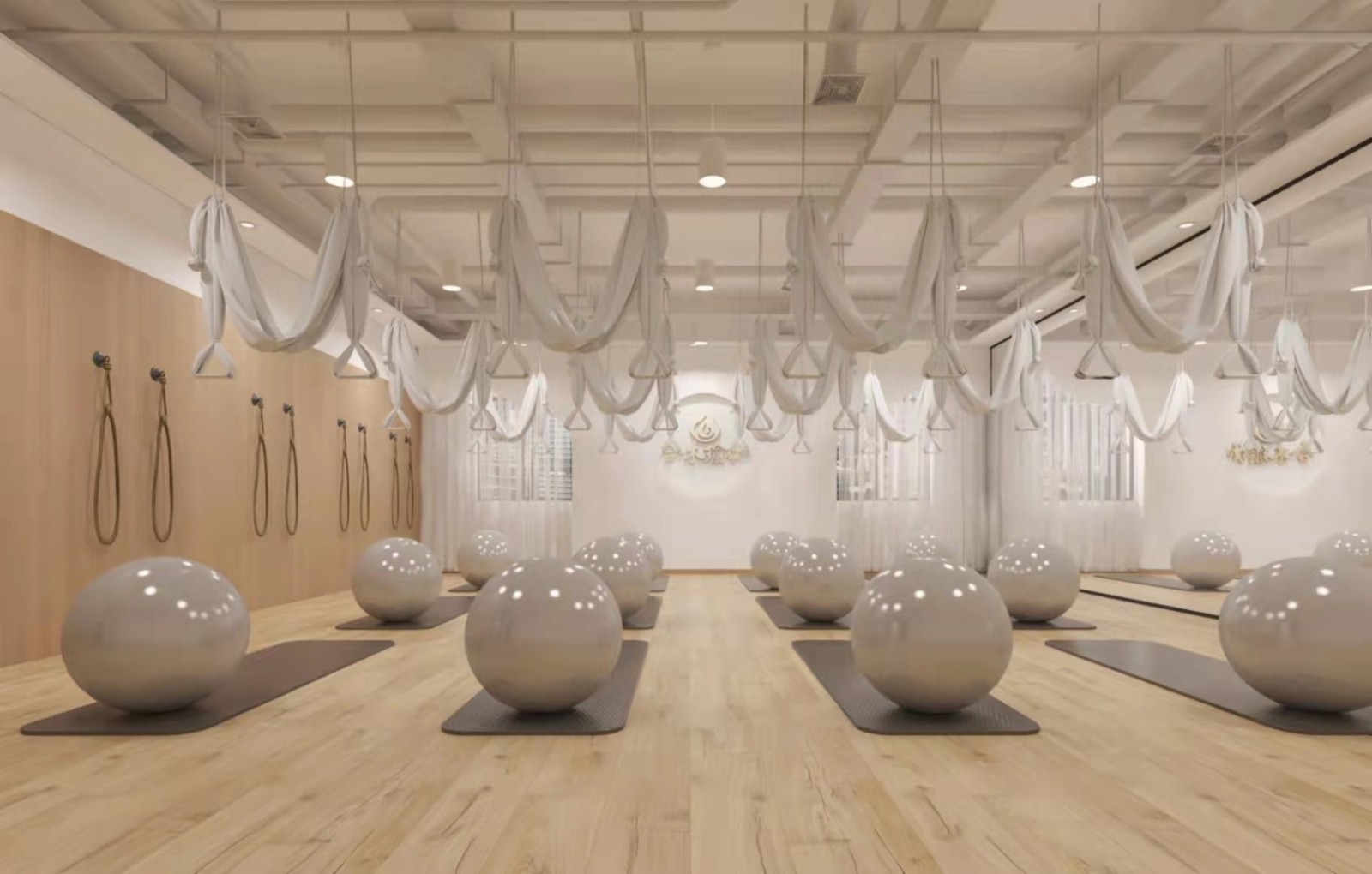 以稳重木料的接待柜台为中心点,塑造明确的区域分界,整个瑜伽教室形成一环状动线