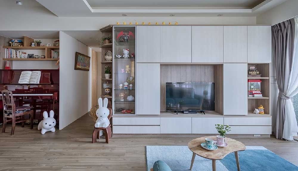 将沙发后方赋予书房用途,并于纯净壁面佐上一道实木饰板,提升视感温度同时,将凌乱开关线路消隐无形;同步以暖白与原木系统板材筑构电视柜,采以斜面收边修饰动线外,挹注开放层架与玻璃展示柜,使珍藏的绝版食玩及各式模型公仔皆能妥善陈设。