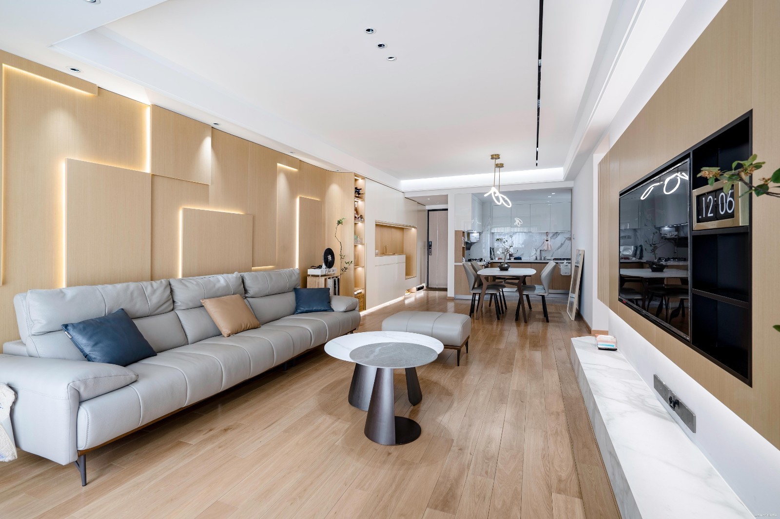 电视墙 挺简洁的,感觉太花哨影响看电视,电视组合柜挺不错的,和茶几款式一样,都是原木色烤漆面的,原木经典配,就是漂亮。