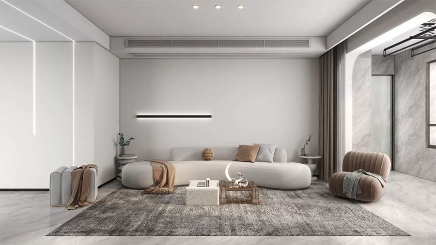 本案风格为极简的装修风格,米白色和暖灰色调的色彩搭配