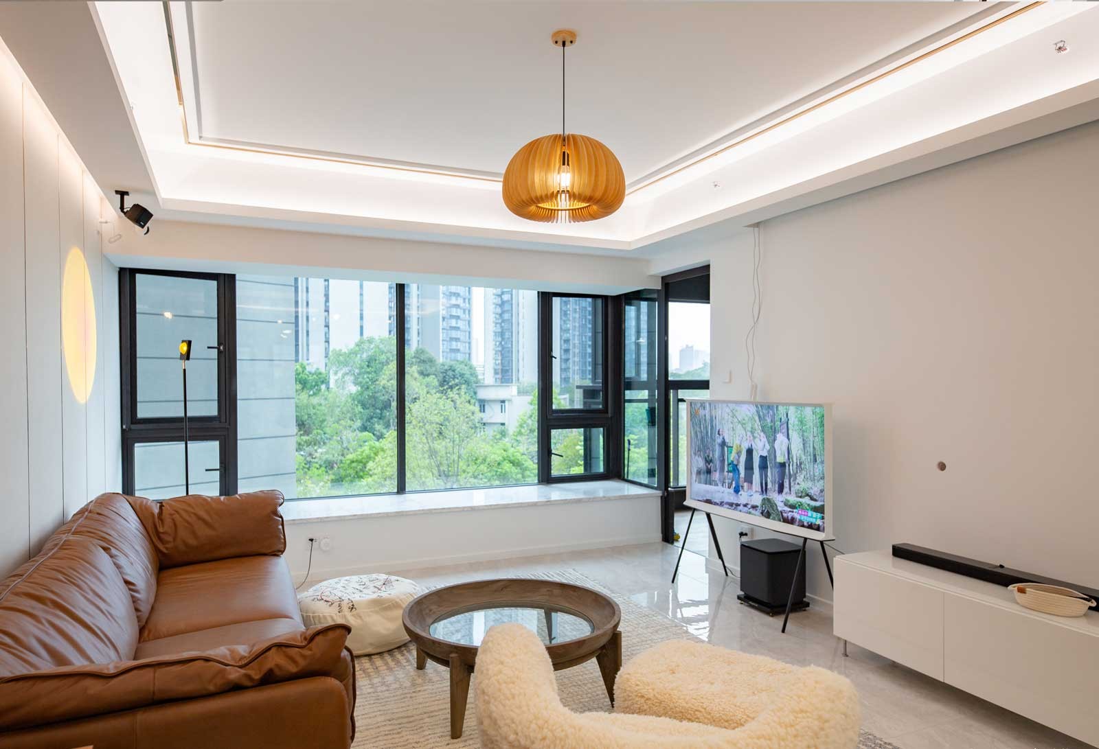 客厅空间在低调优雅白的基底包围之下,橘色温婉装点,弥漫一室浪漫情韵。橘色的沙发搭白色的羊毛凳组合,橘色时尚糅合白色的温婉,形成优雅气韵,犹如柔光下轻扬起的一曲华尔兹,滑步旋转间,绽放出居室旖旎浪漫的情绪。