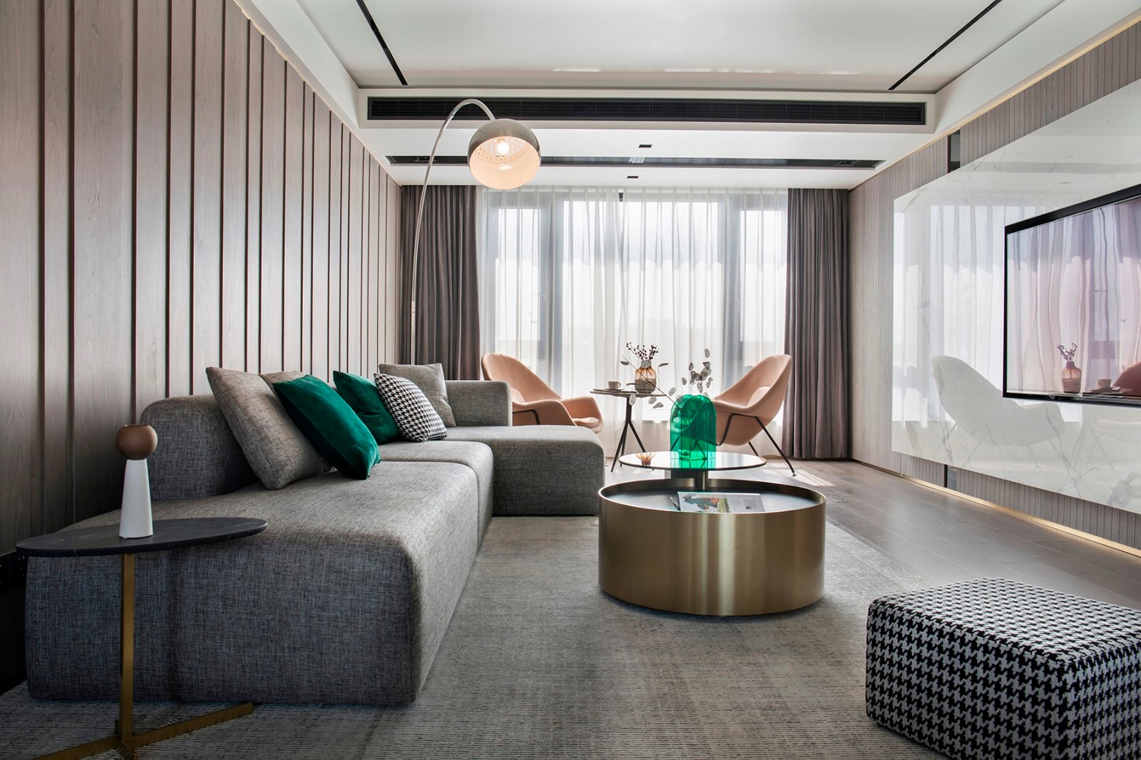 客厅没有主灯吊式,采用灯带,既丰富了空间层次,又呈现出朗阔旷达的中空格局。设计感十足的金属落地灯作为空间的点缀,活跃空间气氛。