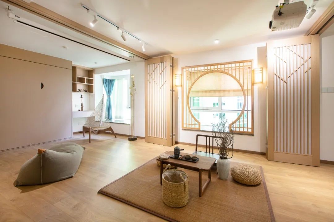 休闲区两侧是卧室空间,以屏风作为隔墙,平时开启屏风可以让空间打通;