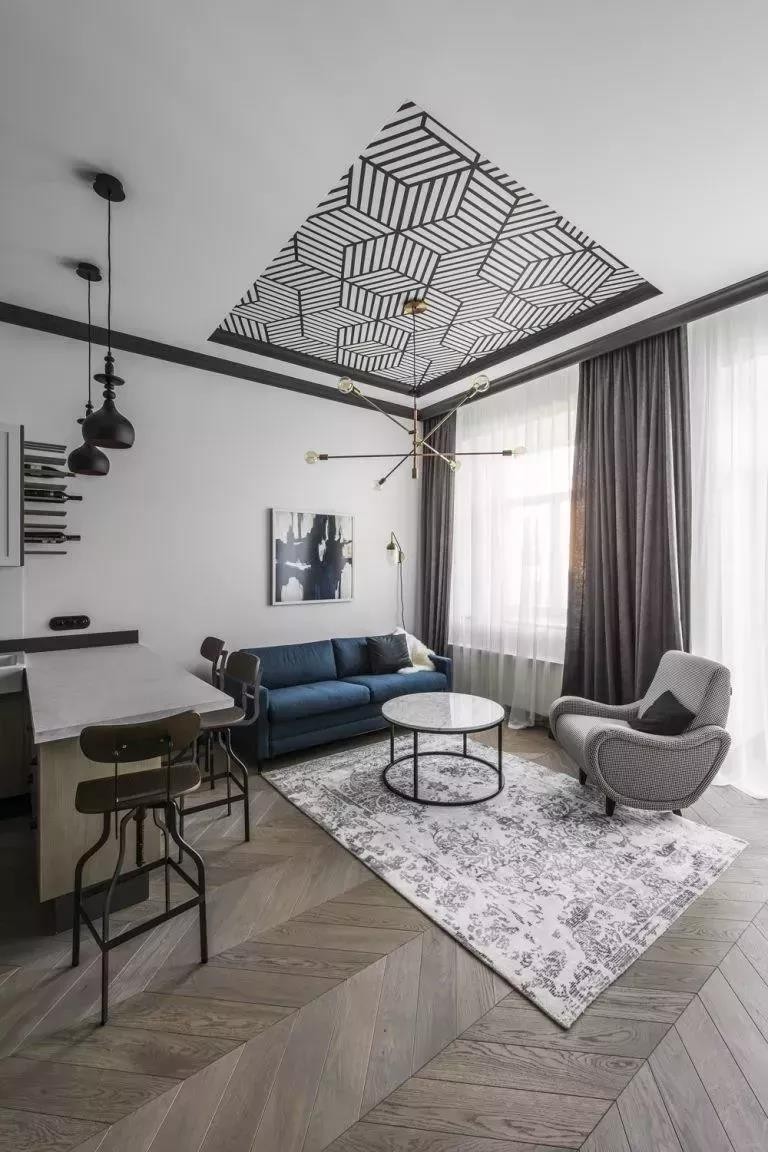 这是一个小户型,开放式的厨房和客厅,设计师将一面墙壁处理成深灰色,因为对面和房顶有更大面积大白色与之配合,***人们得到的是比中间调子更明亮的视觉感受。
