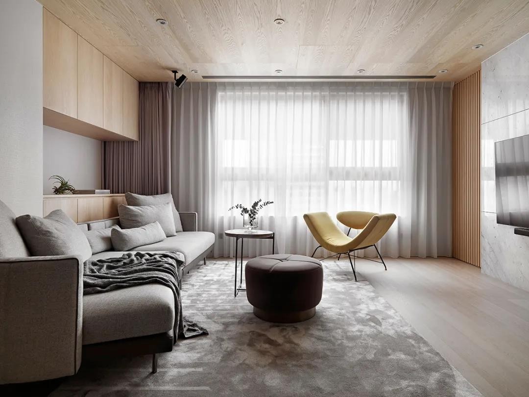 属于橡木的轻柔纹理,沿著天花温柔蔓延而开 包裹起客厅的日常光景,也分散了低樑位的窘迫 循序落下一道云雾大理石成为清晰分际 以雾灰脉络沁出自然气息,使简约与奢雅不再对立