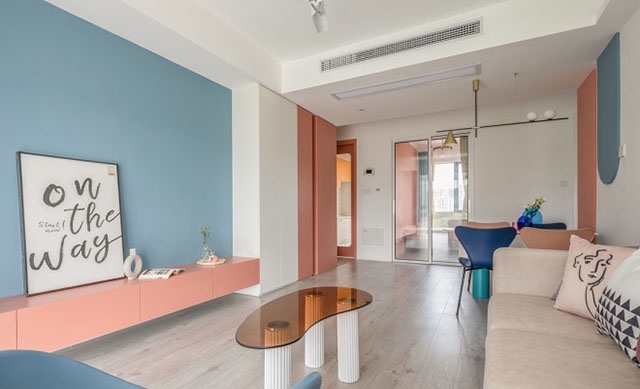 客厅同样围绕蓝色、粉色和白色延展开来,达到跳色效果的同时也凸显出墙面的立体感!