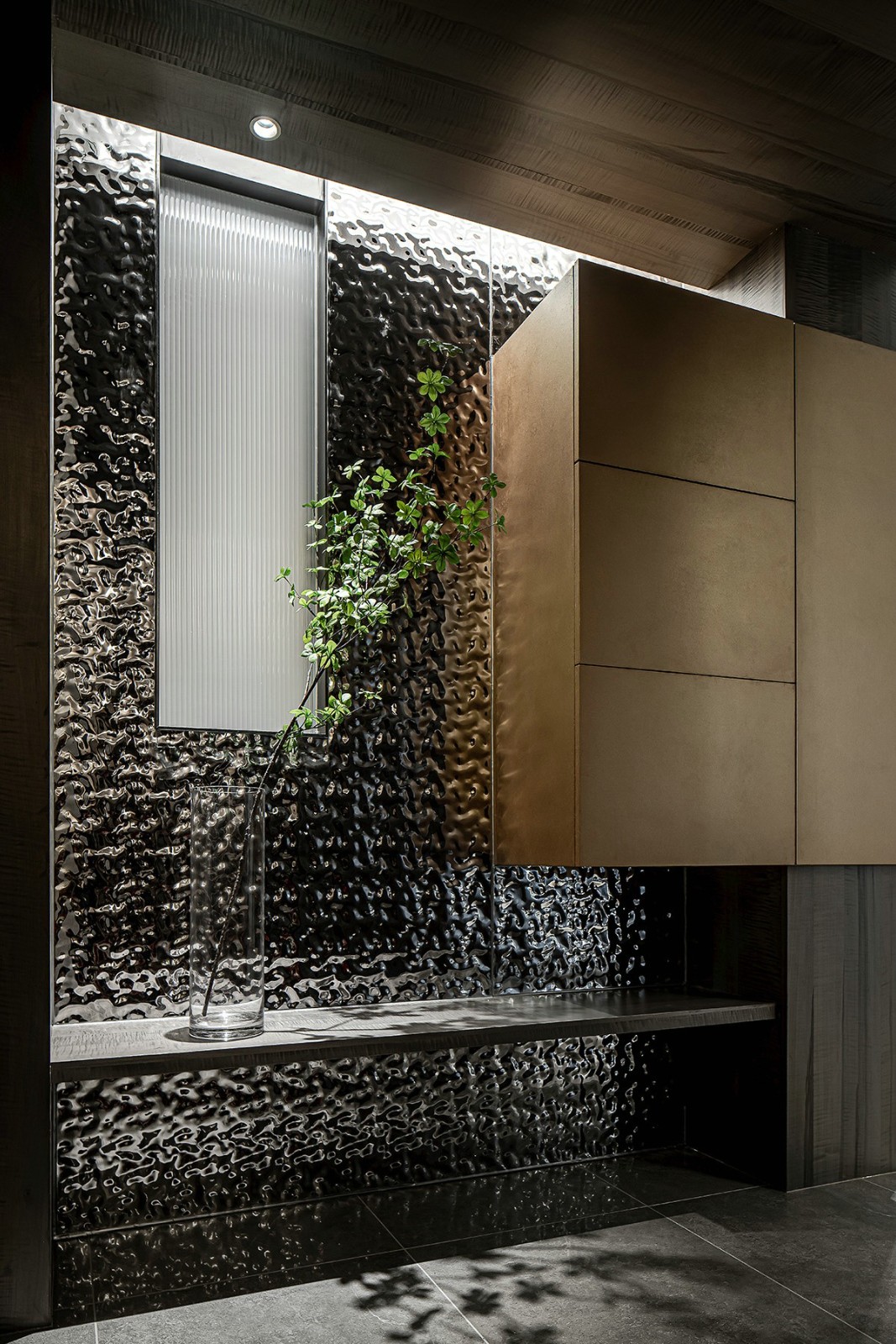 艺术是永恒的内核,而自然是不露痕迹的生动点缀。在本案中,我们不仅可以看到大量天然的木饰面如何为布局带来时尚的统一感,而且还可以看到特殊的水波纹铝板在不同的区域都能延伸呼应。