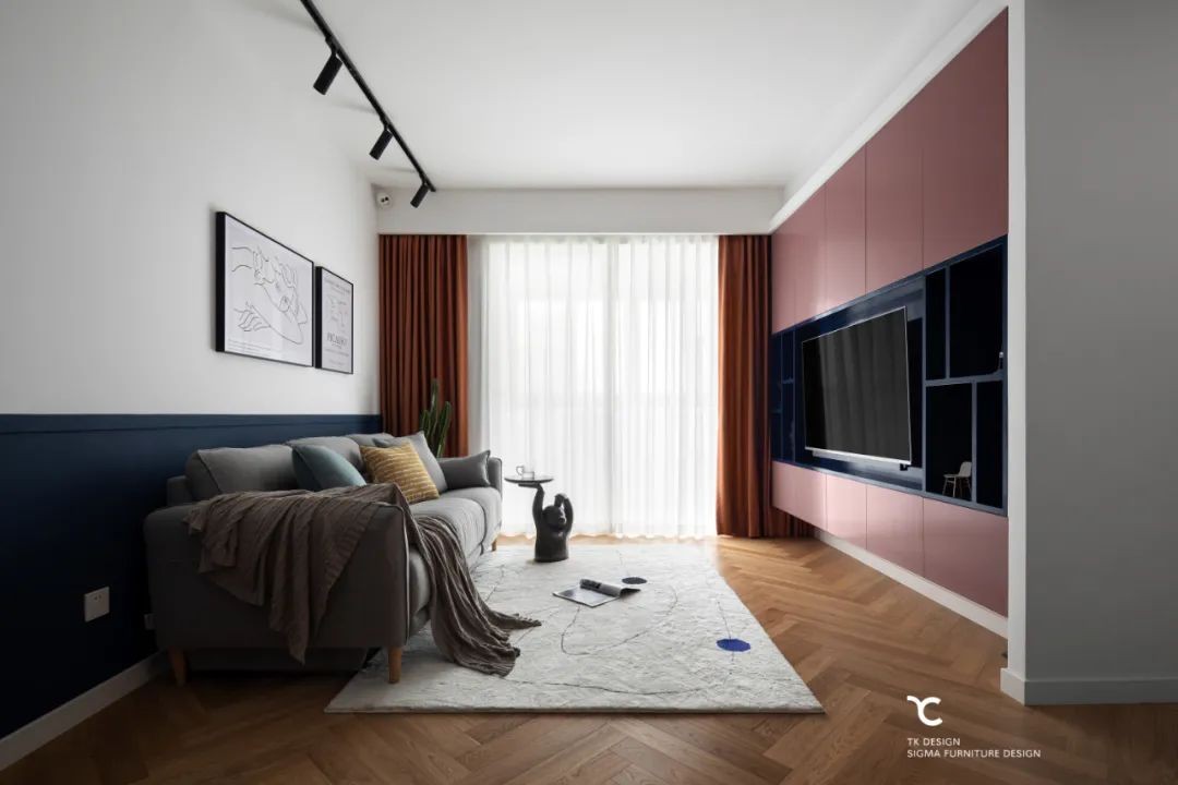 1/3墙的深太平洋蓝给空间注入或奢或雅的情调,与暖色调的玫瑰沙龙粉互相调和,深浅浓烈,几分回味,好似海上明月相伴,星垂涛声依旧。