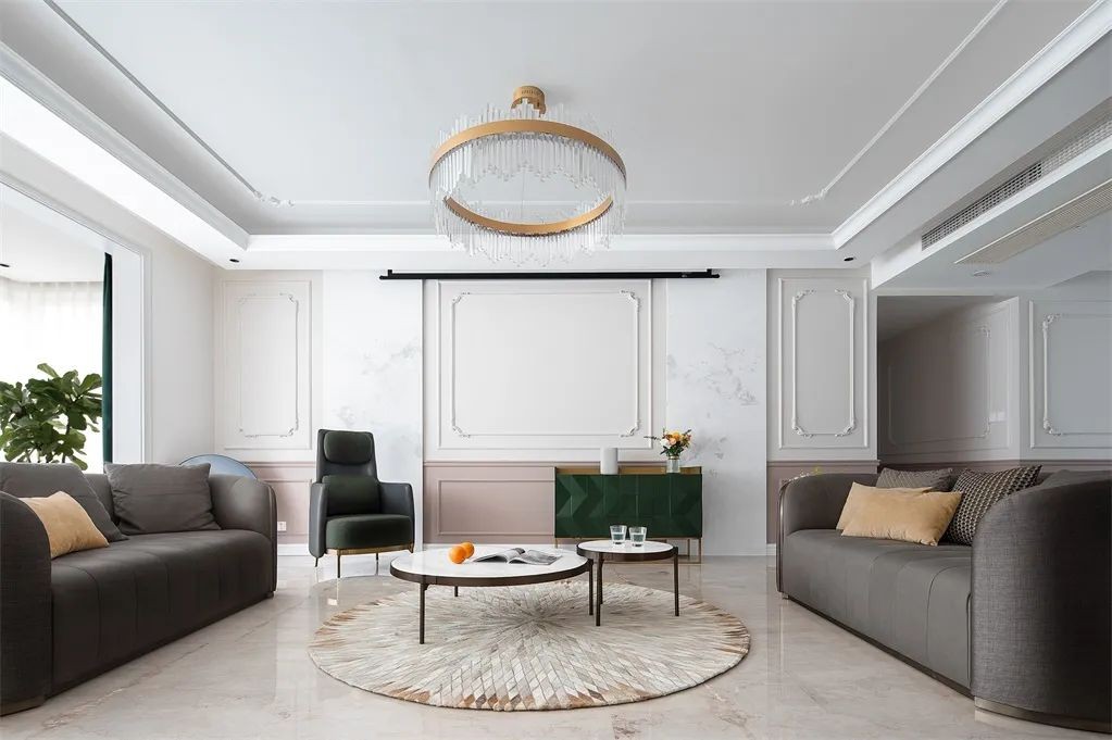 电视背景墙做了PU线条和分色墙设计,搭配白色大理石内嵌灯带,不同的材质进行碰撞,呈现出不同的视觉感和层次感。