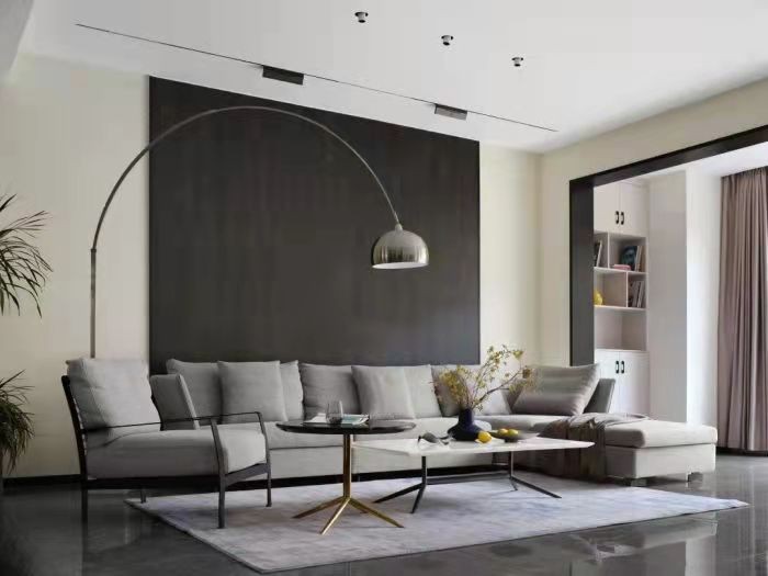 客厅中,不论是素雅的布艺灰色沙发,还是由几何线条勾勒出的黑白茶几,都十分利落简约。悬空的弧形落地灯为空间增加了柔美之意,与低矮的沙发茶几形成对比,丰富了视觉层次。