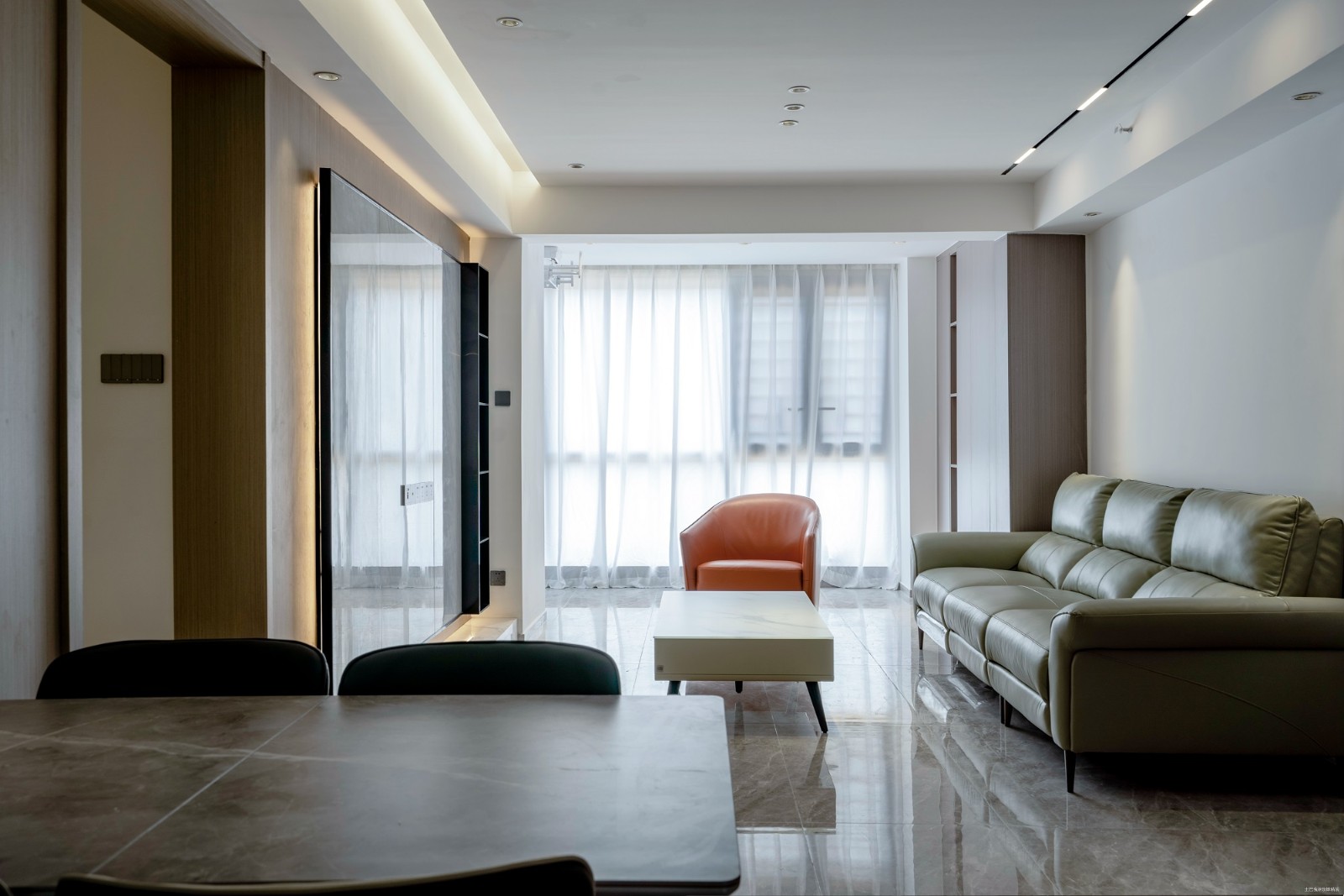 餐厅区域整排的柜子在收纳上规整了空间,再搭配一组玻璃柜门的展示柜,能收纳很多具有展示意义的物品在其中客厅沙发后期再通过挂画装饰一下,配合筒灯和磁吸轨道灯的光照来补充室内的设计感