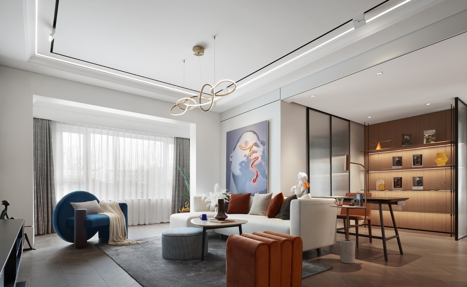 整体设计以灰白调为主,,通过木色的背景墙衔接形成强烈的黑白灰对比,质感悠然而生
