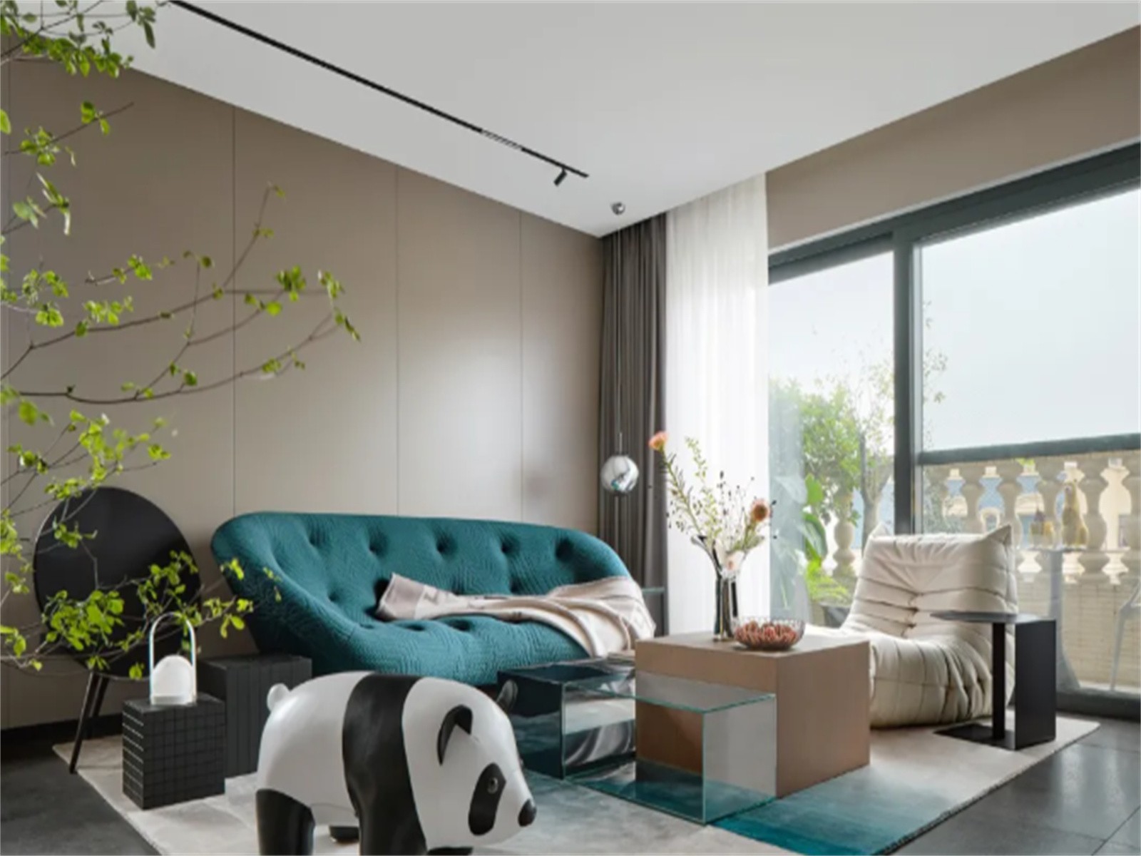 暖灰色硬包背景贯穿整个空间,茶几造型前卫而不失温润感, 大熊猫座椅带来几分愉悦与轻松