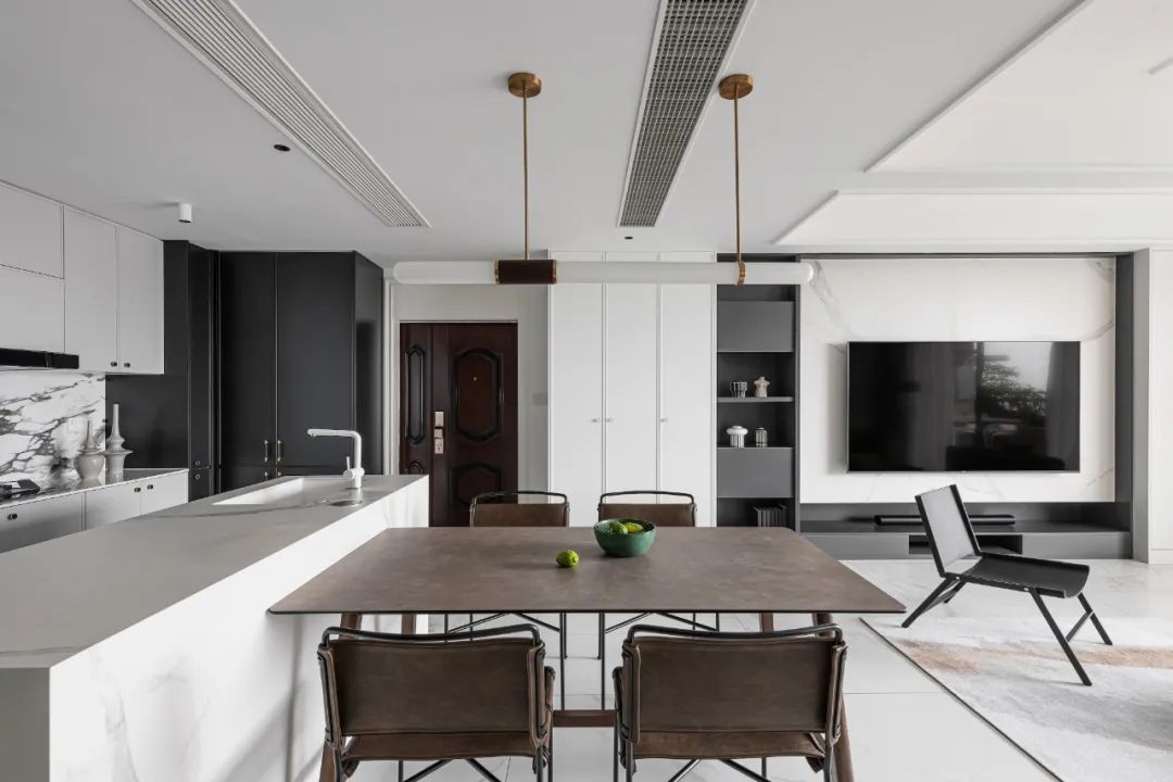 厨房、餐厅、客厅呈一字型分布,视线开阔。餐厨区域以岛台为中心,形成洄游动线。