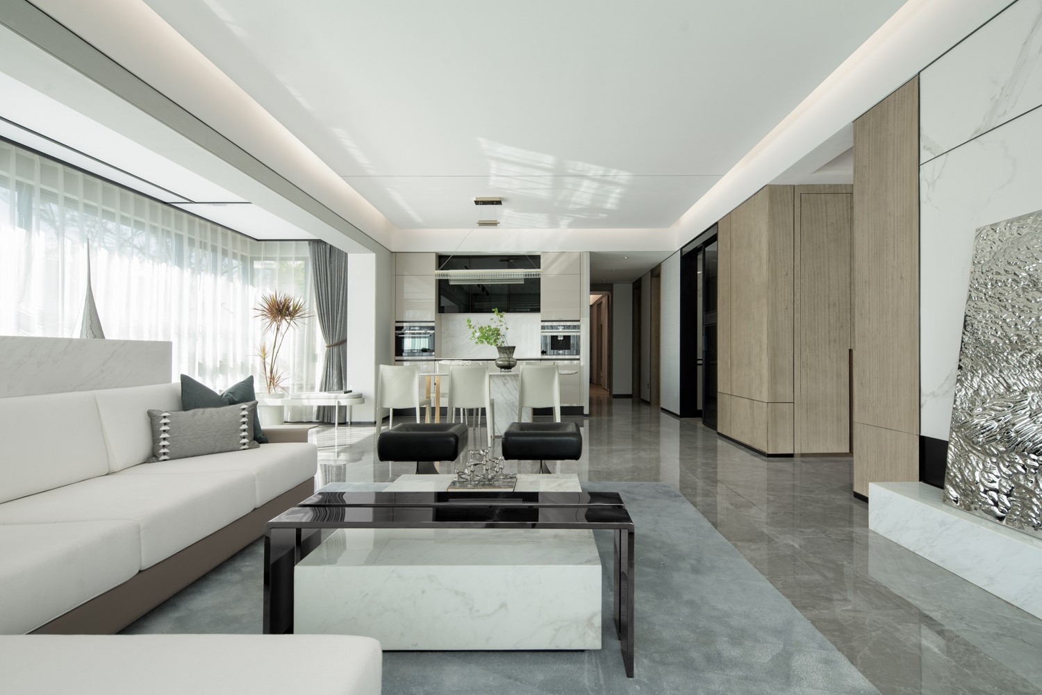 整体设计以灰白调为主,,通过木色的背景墙衔接形成强烈的黑白灰对比