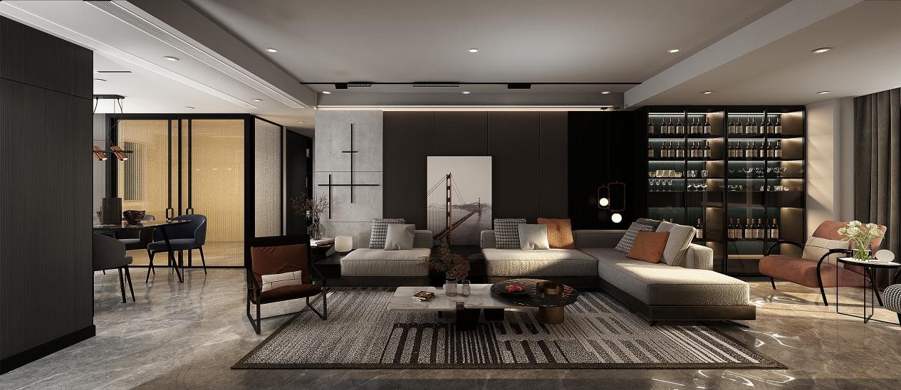 本案空间上,我们希望能够大开大合,依据主人的生活方式,给未来空间留有余地。黑色木纹配合深灰色皮革,奠定了我们的基调。焦糖色肌理画与米色的沙发相得益彰。