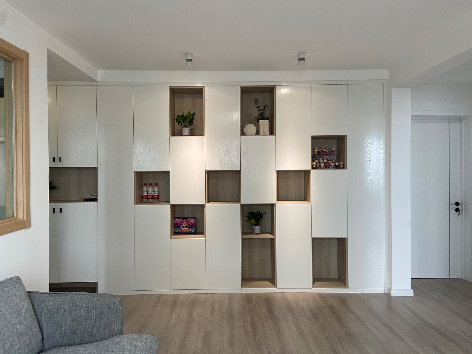 客厅做了整体的玄关柜和展示柜为一体,用来收纳盒展示。好看实用。