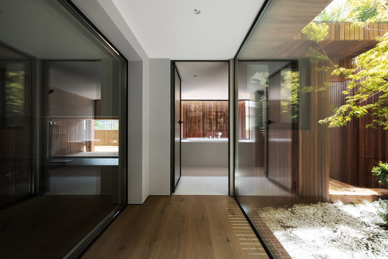 走廊正对浴室浴缸,两侧均为玻璃隔断,左侧可以看到室内休闲厅。