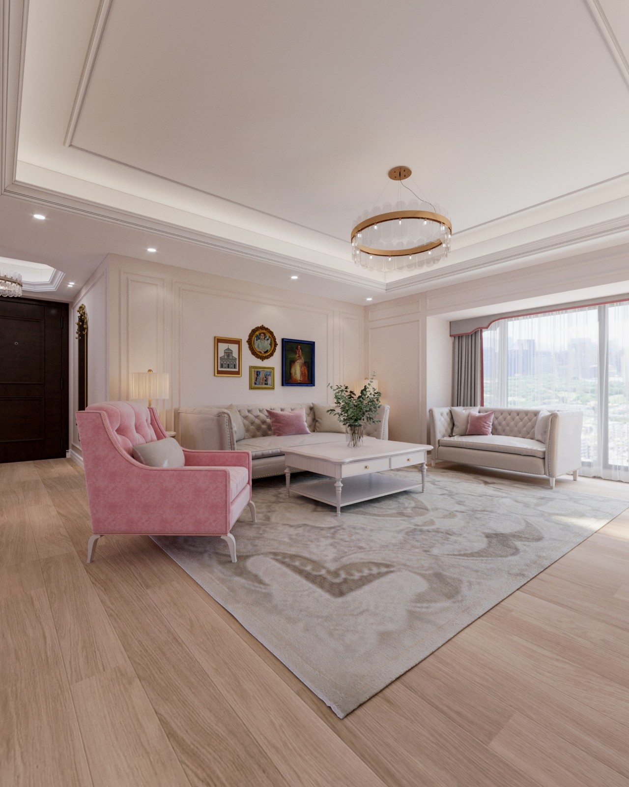 客厅墙面选用浅杏色作为背景色,墙面造型利用双层石膏线,石膏线与墙面颜色相同,降低存在感但又增加墙面细节。沙发杏色的磨砂皮质感温和,粉色的单人沙发作为点缀色,饱和度低的粉色保留少女感更增加优雅感。