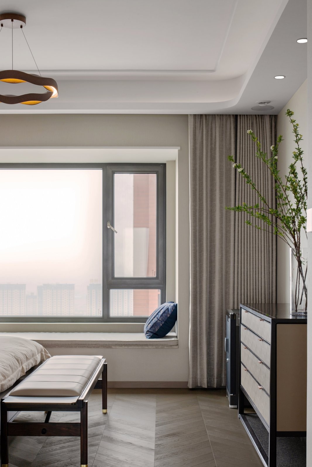 卧室全采用白色的乳胶漆,床,柜子等一系列家具框架全采用黑檀木色,地面采用了地板鱼骨拼。