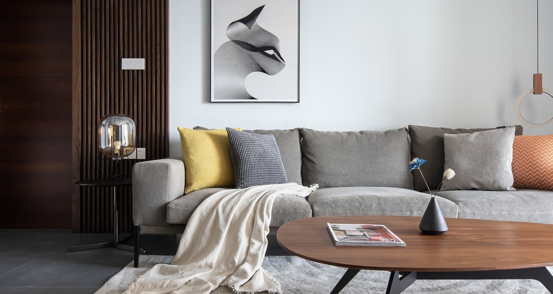 灰绿色墙面与浅灰色地毯覆盖客厅,创造出清醒柔和的视觉感,并用些许暖色调软装添入明亮色彩,带出空间轻快氛围。