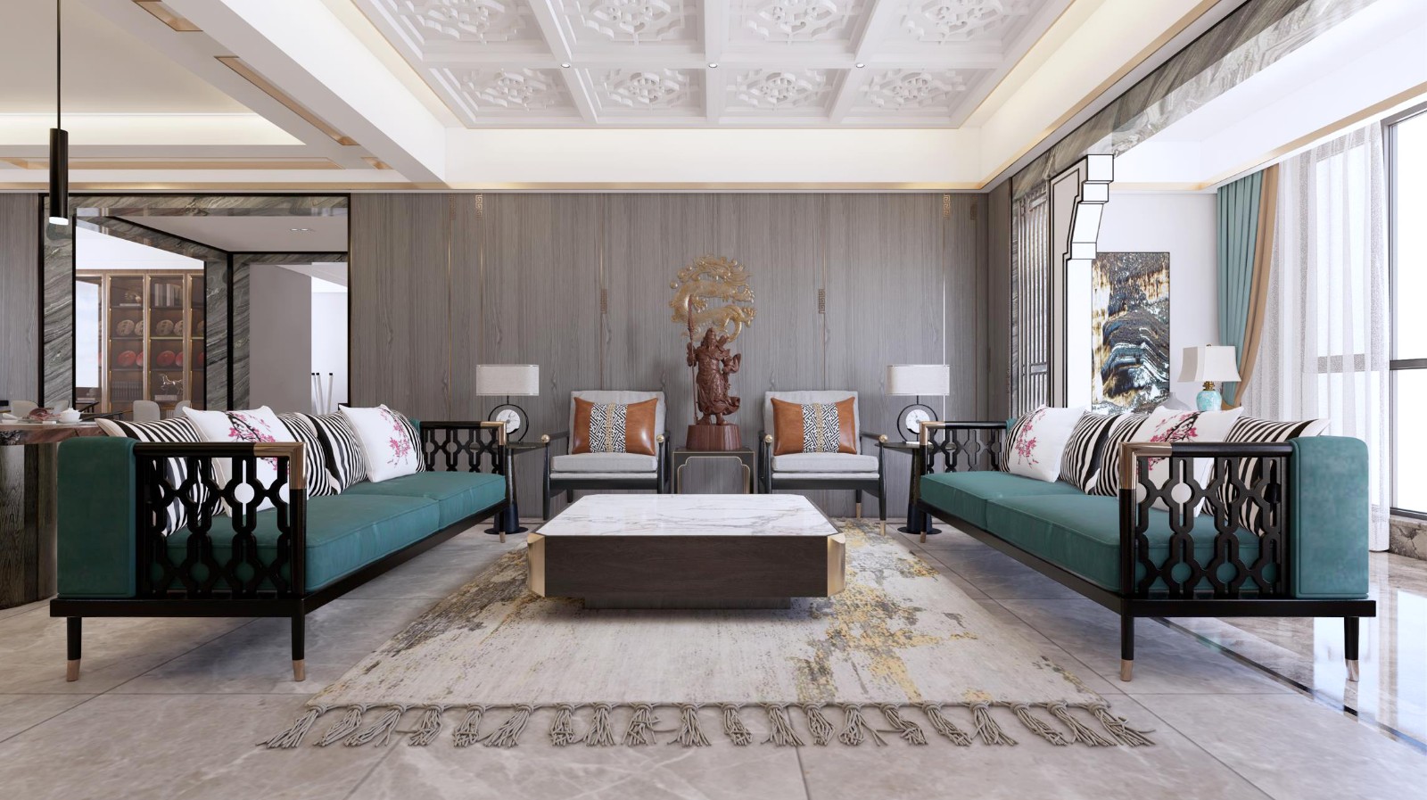 整个空间以灰白色为主色调。金属装饰配木饰面的完美搭配做主背景,抢眼中式元素的关二爷坐镇堂中,抛却传统客厅模式,对方放的新中式沙发从形式上让会客厅整齐对称,体现出主人的沉着稳重感!