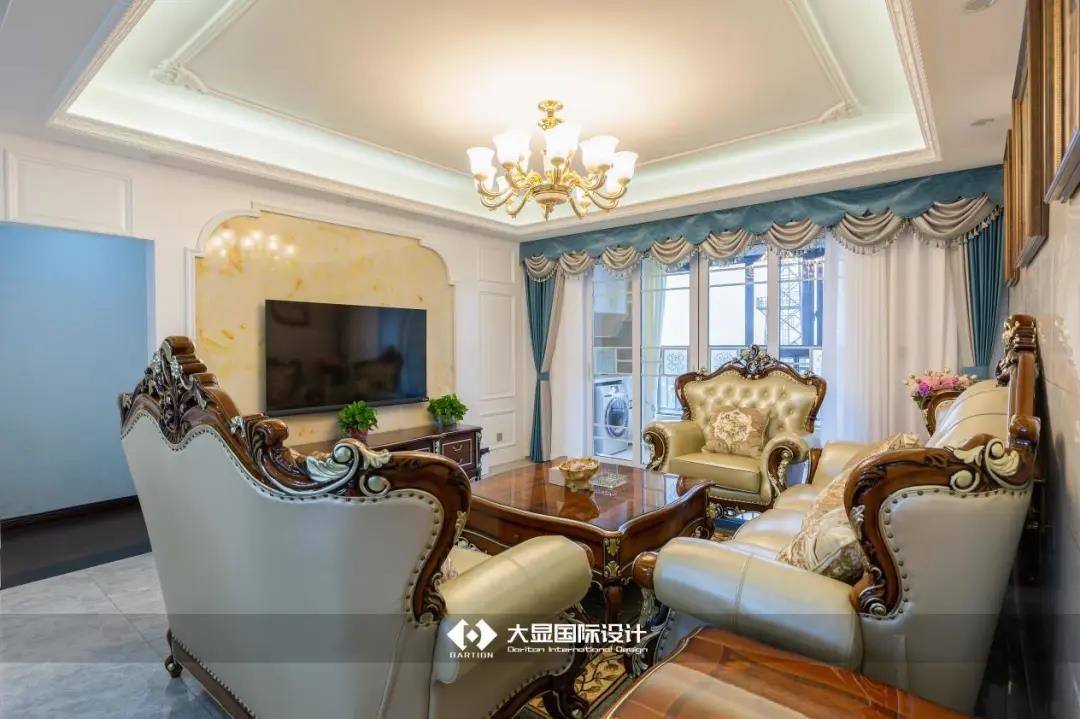 客厅的吊顶布置延续传统欧式风格,电视背景墙也是使用石膏线,体现独特的线条感。