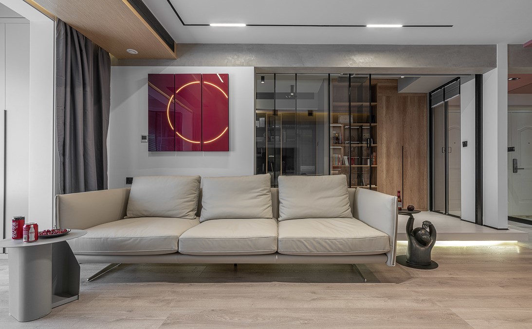 整个空间以白色为底色,搭配水泥漆、***灰,烘托出素雅、祥和的氛围。沙发背景墙上悬挂定制艺术装饰画——极光之美,点明了整体空间的主题,科技与艺术并存,实现在家就可以欣赏极光的美丽愿望。