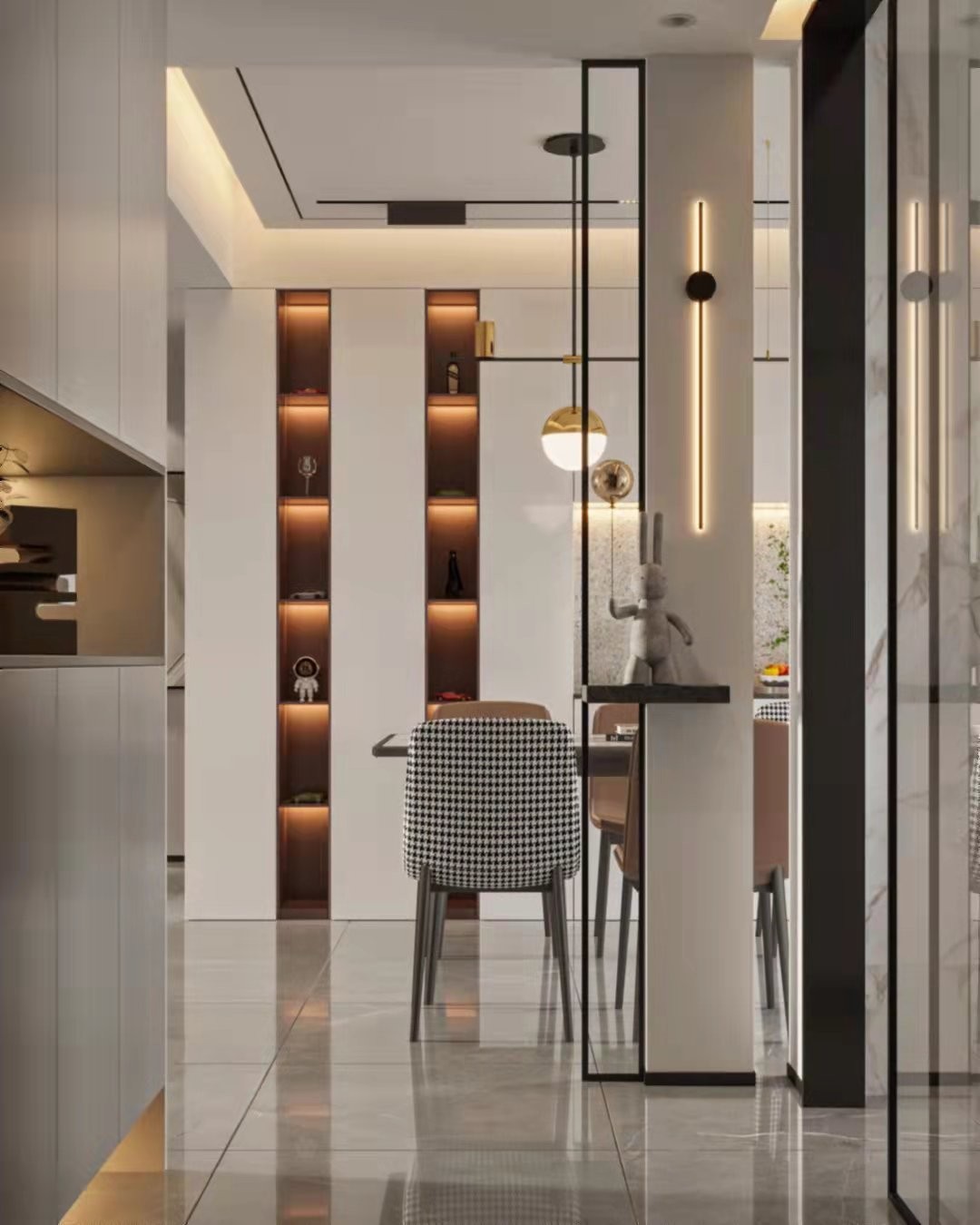 客厅的装饰不容小觑,一般来讲,它分为三大功能,分别是会客、就餐和学习,由于人们回家后大部分活动都在这块区域进行,因此成为家庭生活的枢纽区域,另外为了体现不同的生活层次、业余爱好、交往群体,并映射主人的系统设计思念