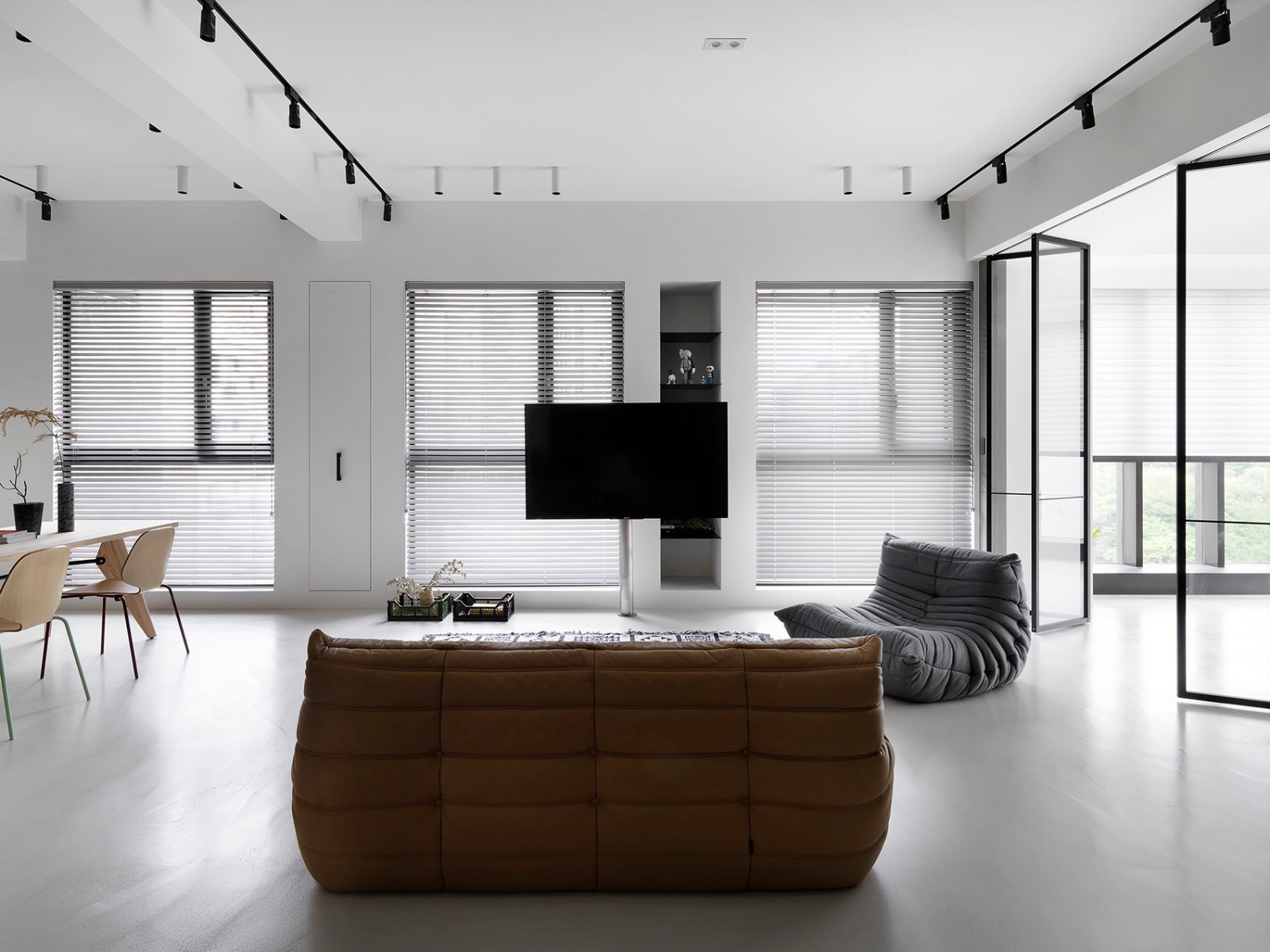厨房区域被地板上较暗的灰色阴影和两边的木纹水泥墙划定,而其余的客厅则被白色的墙壁和延伸到温室的浅灰色混凝土地板所包围。