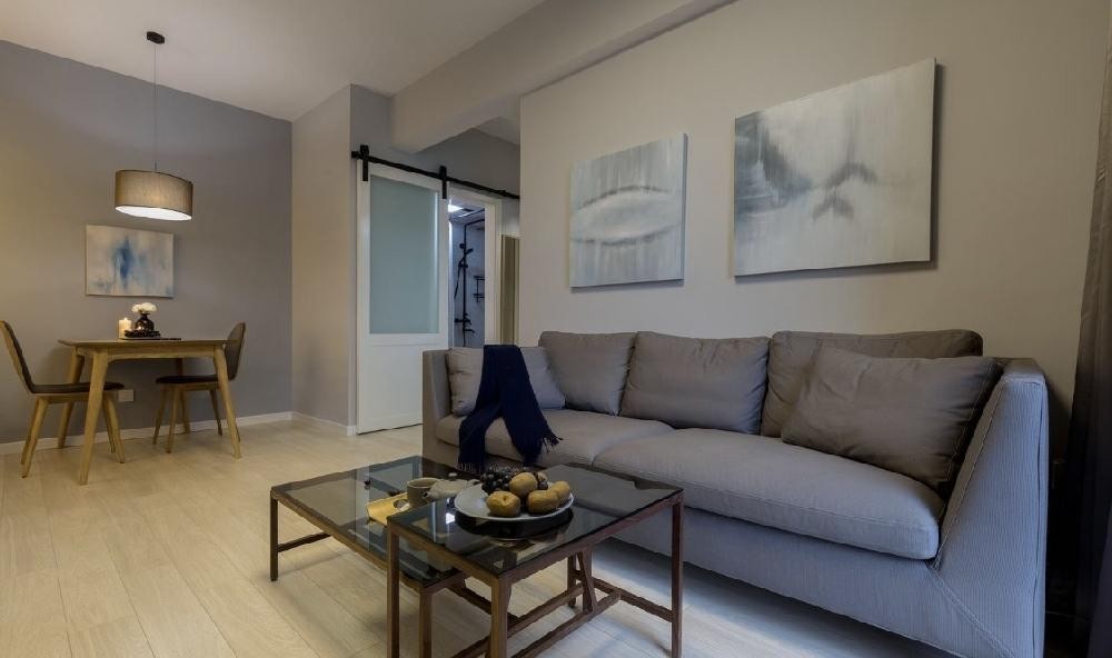 为了降低客厅的拥挤感,客厅的茶几选择了玻璃材质,高低茶几更为空间带来活力。