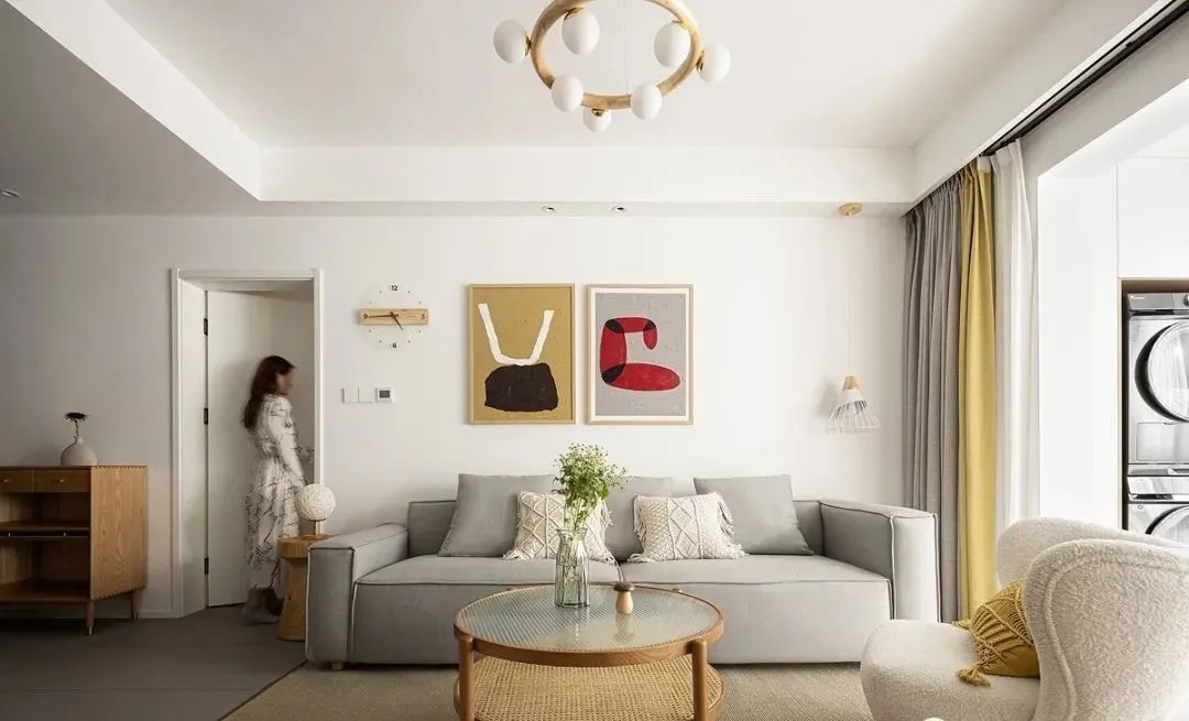 客厅,整体以灰色、白色、原木为主,搭配藤编元素、绿植,给人干净温馨的感觉。