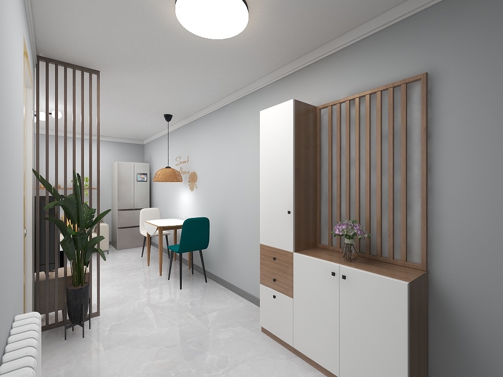 门厅做整体鞋柜,地面通铺瓷砖,做折叠餐桌