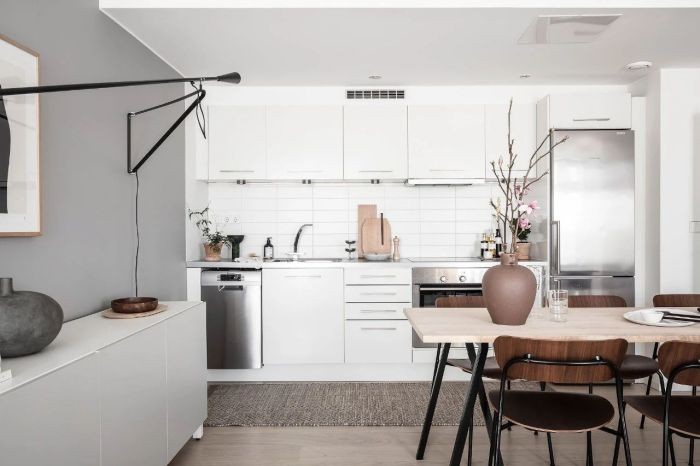 开放式餐厨,以黑白灰和温润原木为主。餐边柜一侧的墙面涂刷中性浅灰色,其余大面积留白,烘托清雅气息。