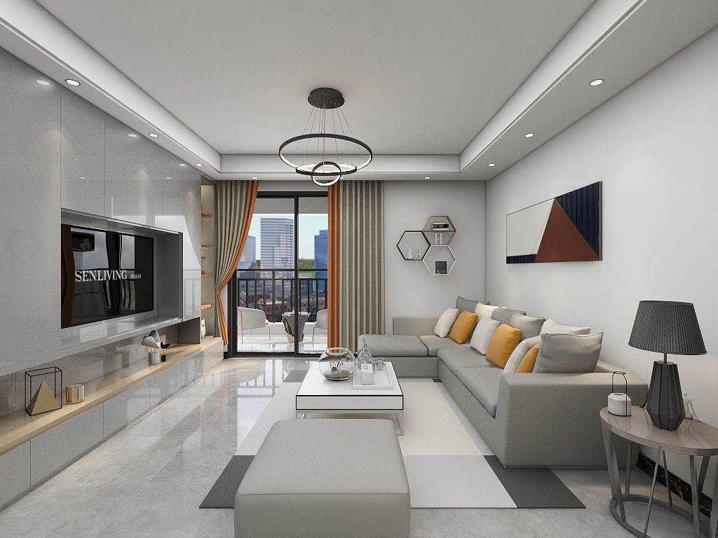 大厅的活动区域地面铺的是灰色地砖,家具主要以灰和色橙色的搭配,沙发是软质的自由组合的的沙发套件带来的饱和给客厅带来了一种包裹的柔软的质感