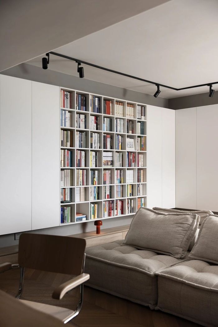 统一的白色柜体围合,一面是书海阅读的慢生活,一面是嵌入式的沉浸视听享受,空间主题的随意转换,让功能变得更加无界。