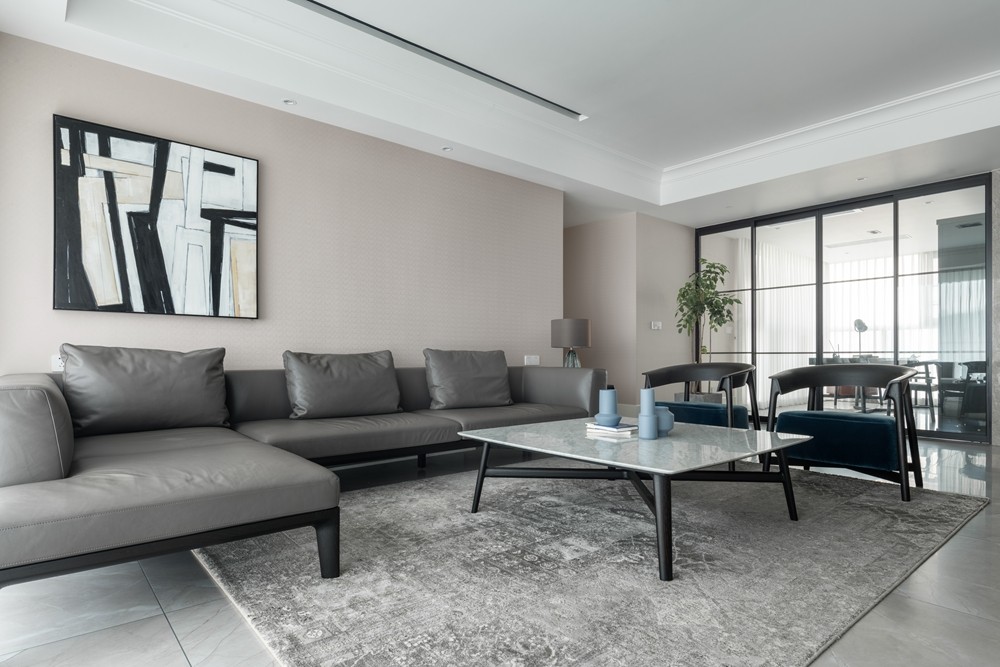 客厅光线充足、电视墙上的嵌入式柜体,兼具实用性与美观性,设计师在尺度比例、材质工艺的选用上都进行了细致充分的考量,有着干练、和恰如其分的***感。