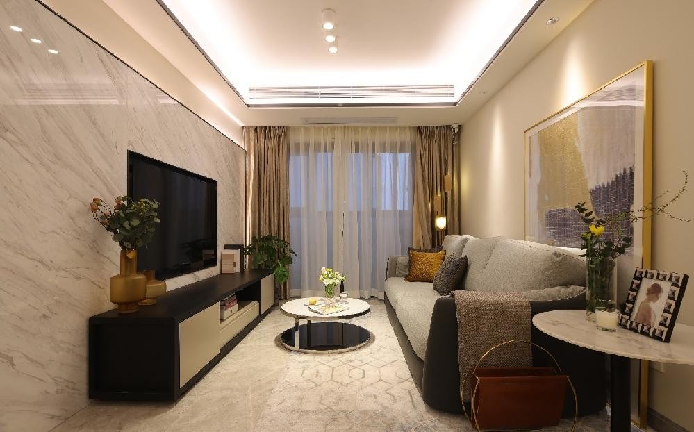 电视墙由3片完整的爵士白大理石拼接而成,背面搭配了隐藏式灯带,营造出时尚高端感。②电视内嵌在背景墙内,从侧面看,电视墙是一整个平面,效果十分惊艳。③简洁硬朗的电视墙,搭配***灰进口羽绒布艺沙发,冷对暖,硬对软碰撞,让整个空间时尚又温馨。