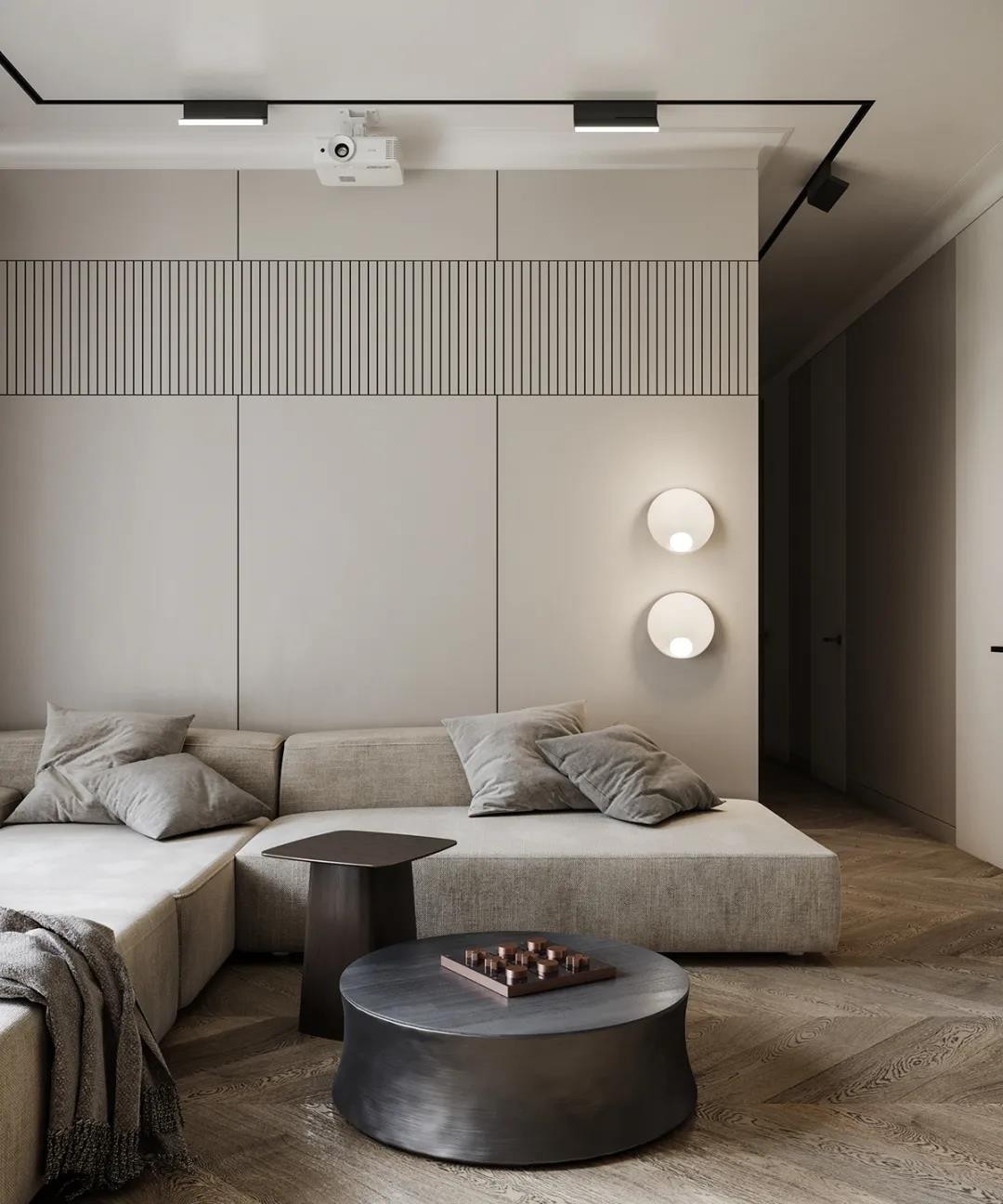 灯轨和茶几则选用了深色 使空间的色调不会显得太单调 茶几的金属感提升了空间的调性
