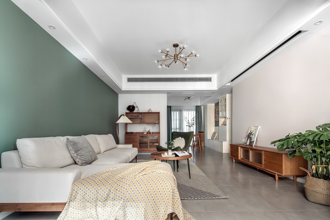 客厅舍弃了普通的电视选择了时下流行的幕布,以白色、樱桃木为主色调,绿色的点缀使整个空间更具有层次感。