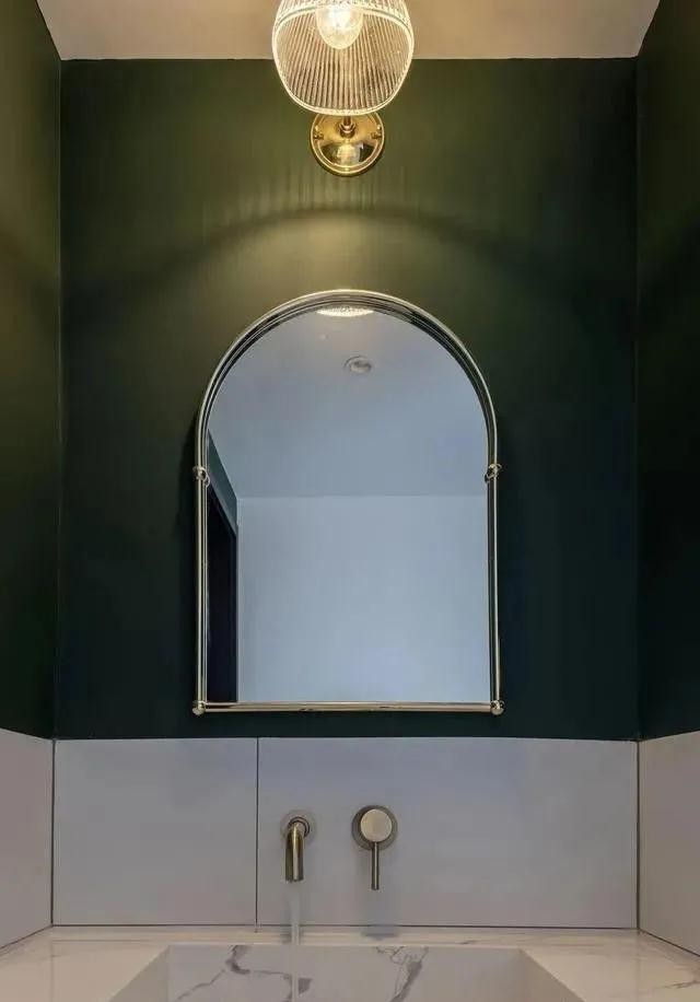 卫生间是干湿分离的。洗手台这边,以绿色防水漆与白色瓷砖和白色洗手台相搭,再以金色的装饰元素作为点缀,将盥洗区打造得精致又有品位,迷人极了。